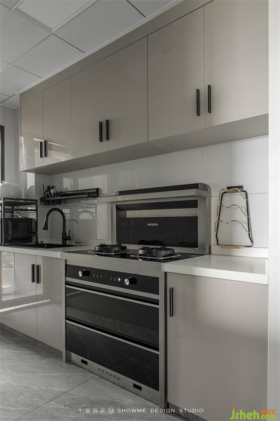 厨房设计以方便实用为主,亮面柜门便于入住后卫生打扫,一字型设计让厨房生活简洁高效,清洗+采切+烹饪区域布置合理,动态路径清晰明了,使用起来十分方便。