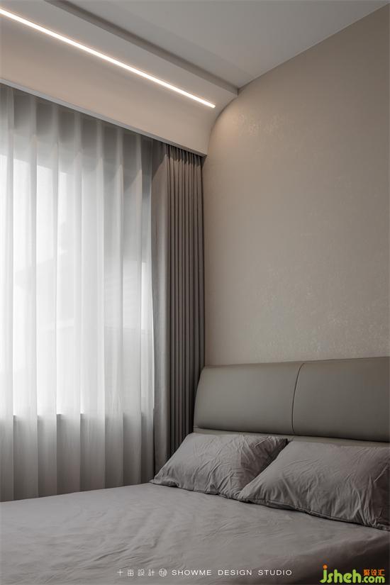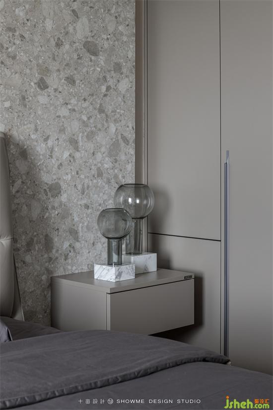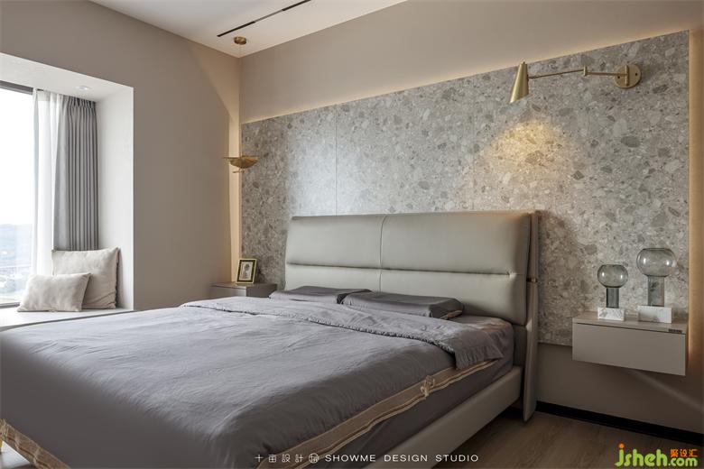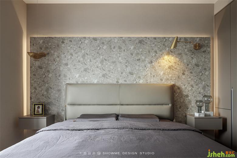 卧室是整个家最温柔的一隅,仿石材花色木板背景墙表达出一种零碎柔软的美,暖色灯带营造出温馨的氛围。