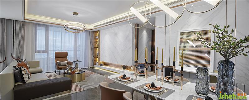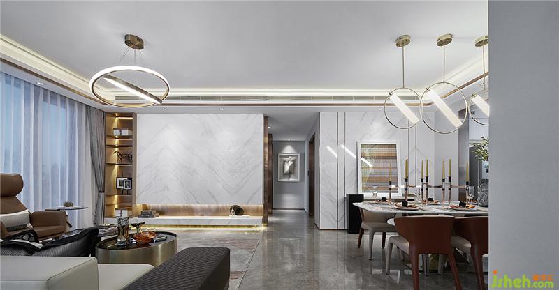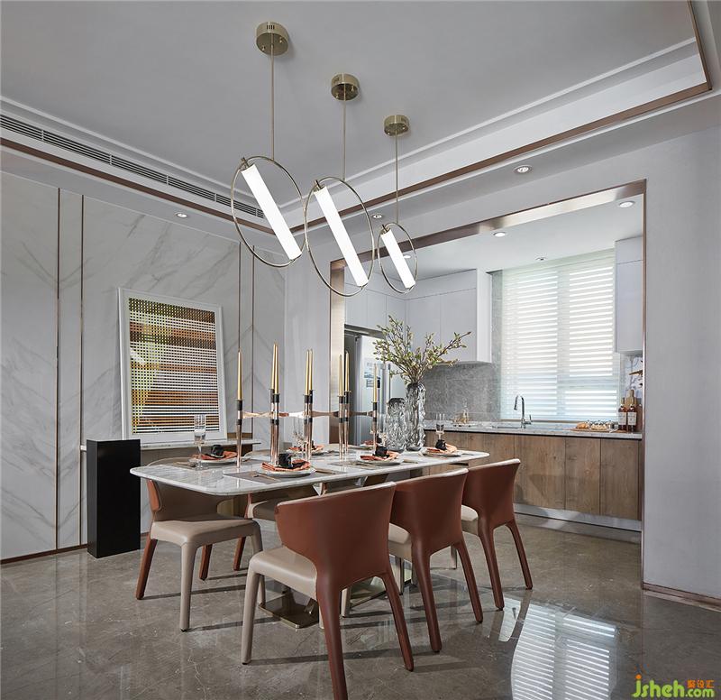 客厅空间的设计,通过块面和线条的塑造使其更具包容性。天花设计不锈钢叠级与墙面竖向的不锈钢收边,突显了空间的层次感与立体感。白色大理石增设嵌入式展示柜,使空间更为整体大气。