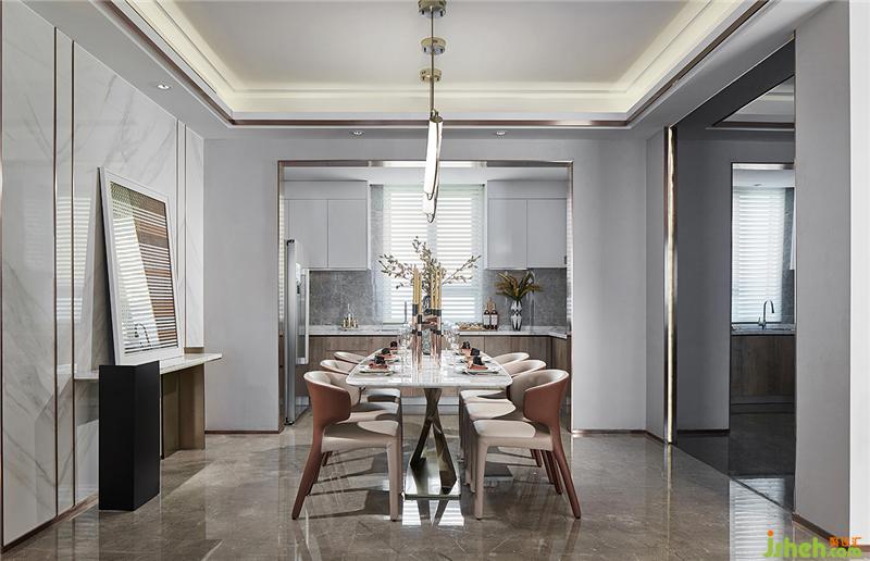 餐厅雅灰度的色彩与白色搭配,虚与实,抽象与具象,空间营造了静谧而深远的观感。