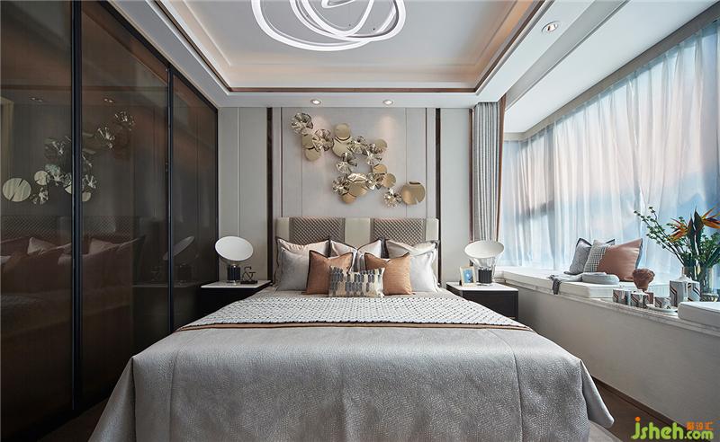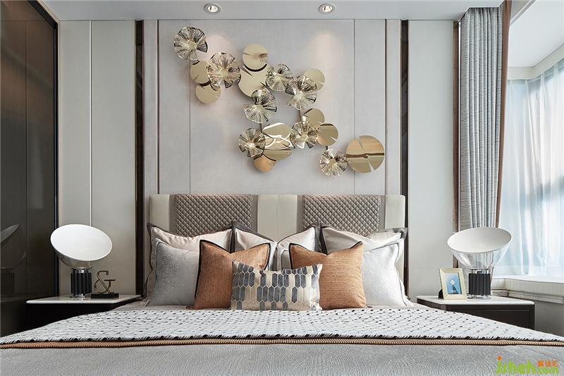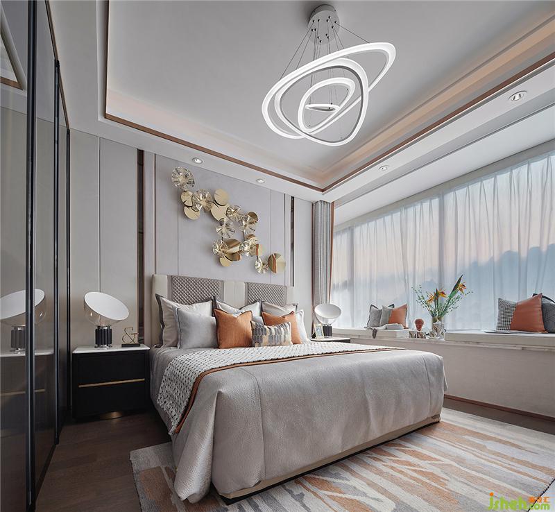 主卧延续公共空间的典雅,灰白橙的相互交融,营造空间的气质,墙上造型独特的艺术饰品在相对简约的空间里有了可品的细节,床品与软饰的质感细腻不凡,匹配主人房的格调与定位。样板房设计