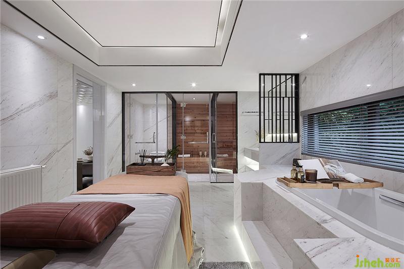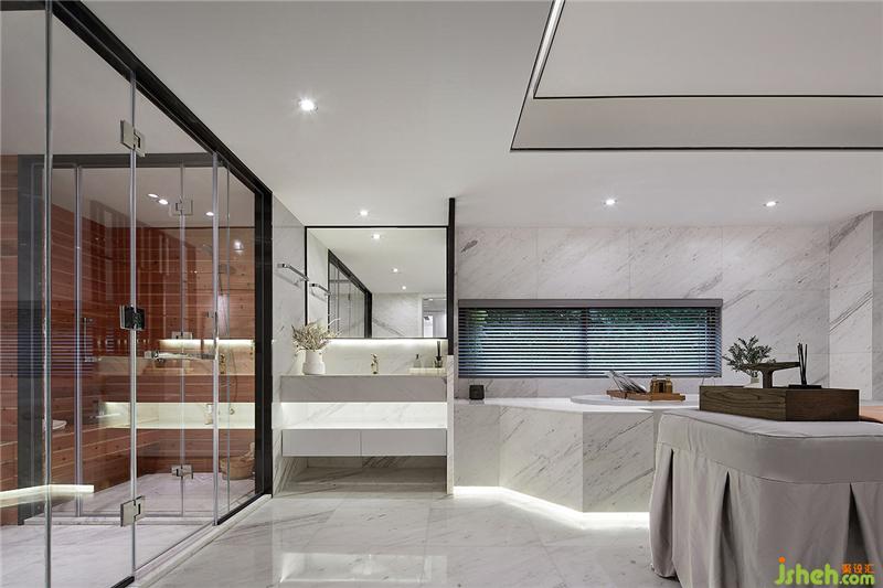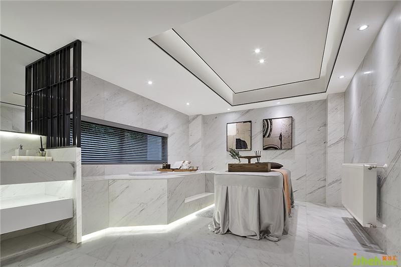 SPA区的设计依然延续白色的主色调,白色大理石材质和黑色镶边相互映衬,赋予空间低调奢华的魅力,彰显高级品味。