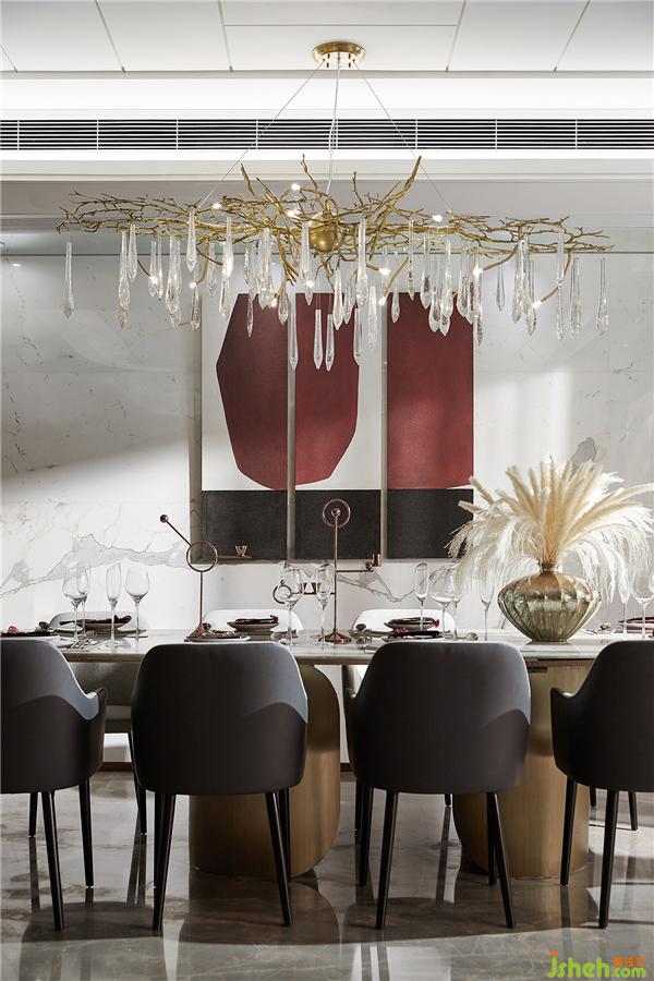 客餐厅的布局拒绝了固有的闭塞,自由畅谈的空间感为居所提供了一个包容性强的场所。酒红色的家具配饰搭配古铜的金属质感制造出家的异质性,空间的优雅精致之感溢于言表。