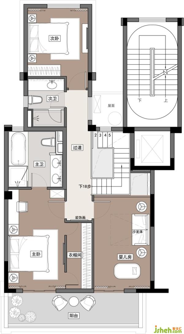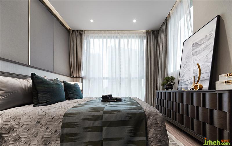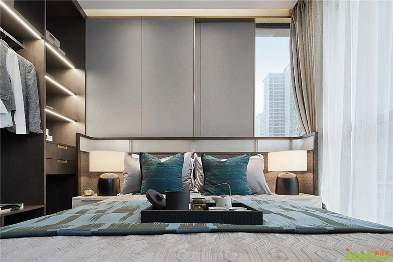空间的美不一定是更多的商业装饰。保留建筑本身的特性,在三面环绕窗户的空间里,可开可合的床背景保证了空间的完整性,亦可释放空间的美。样板房设计