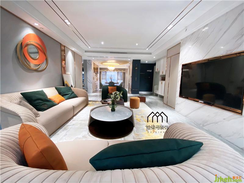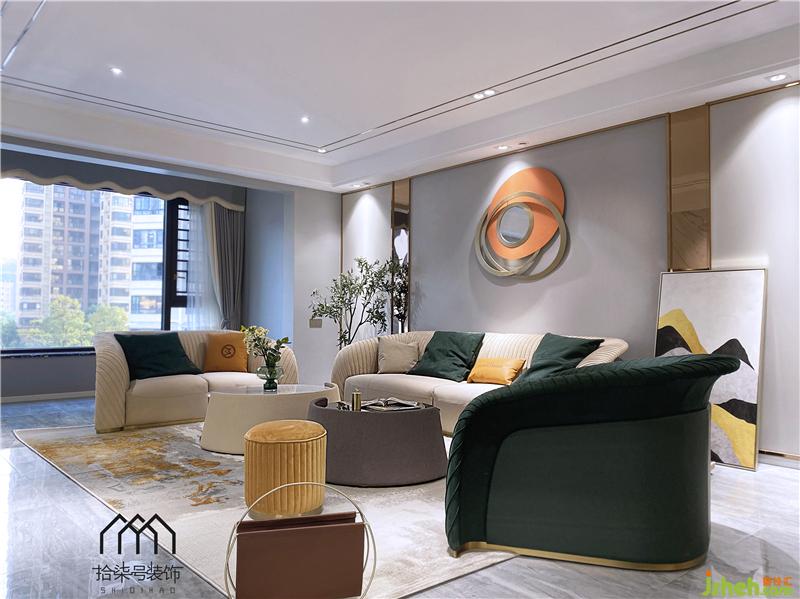 浅色的沙发控制整体色调,活力的橙、高贵的乌绿渲染了温馨华贵的氛围和基调。乌绿是非常高雅的颜色,雅得明朗、雅得有生命力。