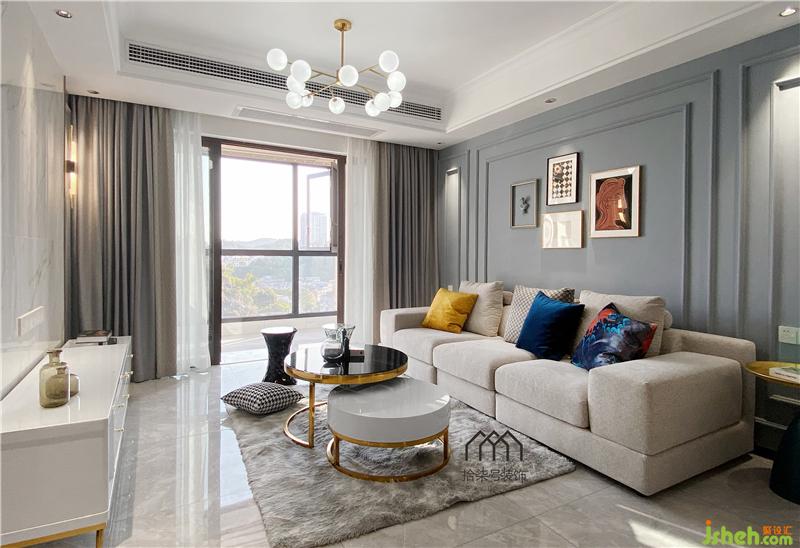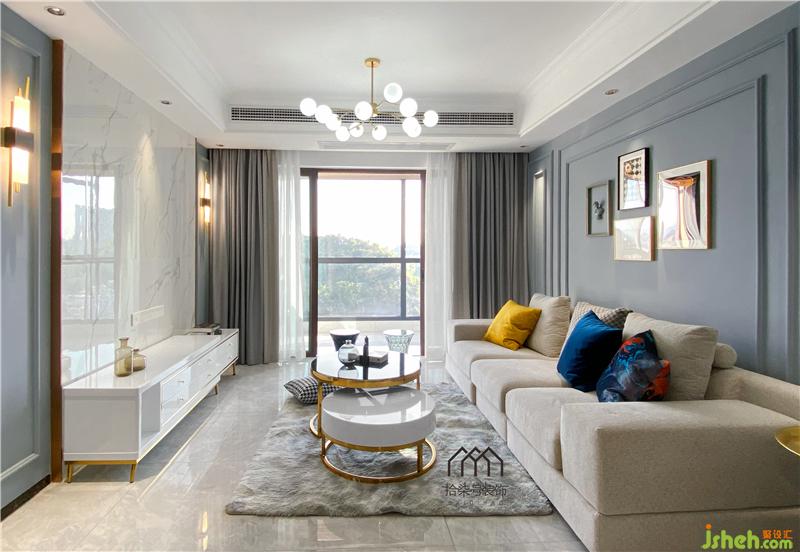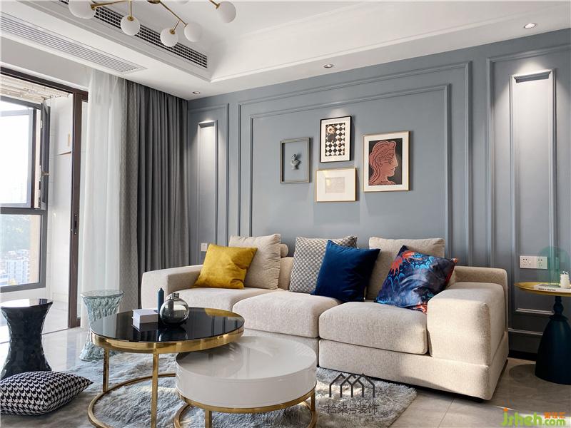 柳州家居装修空间的色调是小清新的雾面蓝搭配素雅的大理石白,柔软的布艺沙发让人一看就想在上面躺一躺。