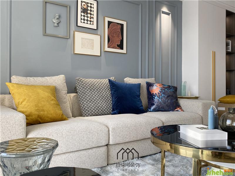 柔软的抱枕,矢车菊蓝的空间点缀。极具艺术氛围的组合装饰画增加空间艺术内涵。