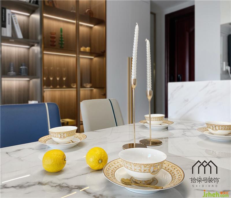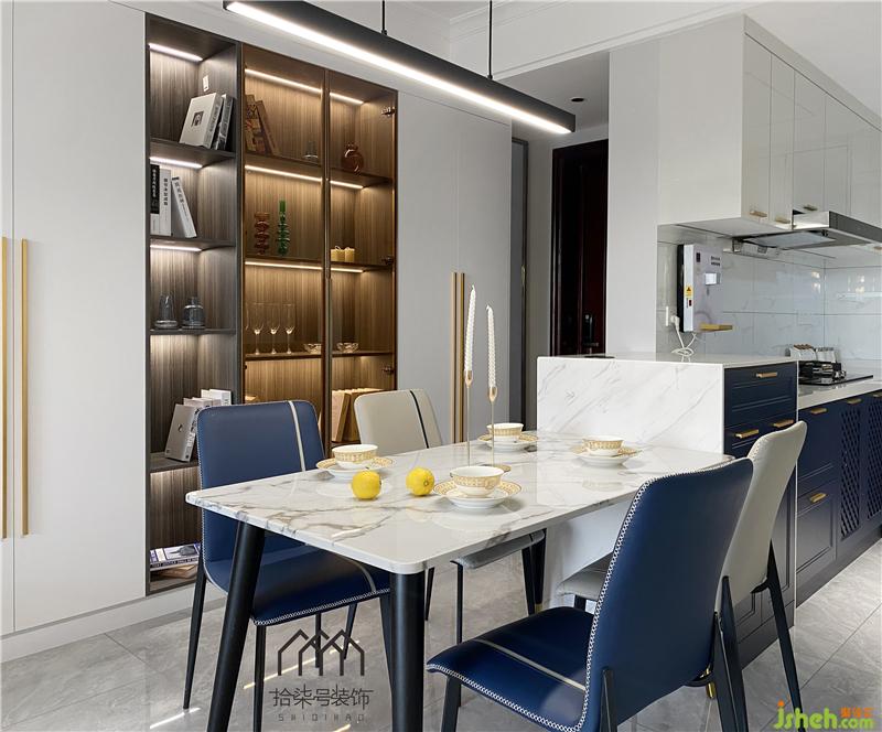 餐厅结合岛台形式,入户装饰柜增加收纳空间,部分开放格划分墙面更有层次感。