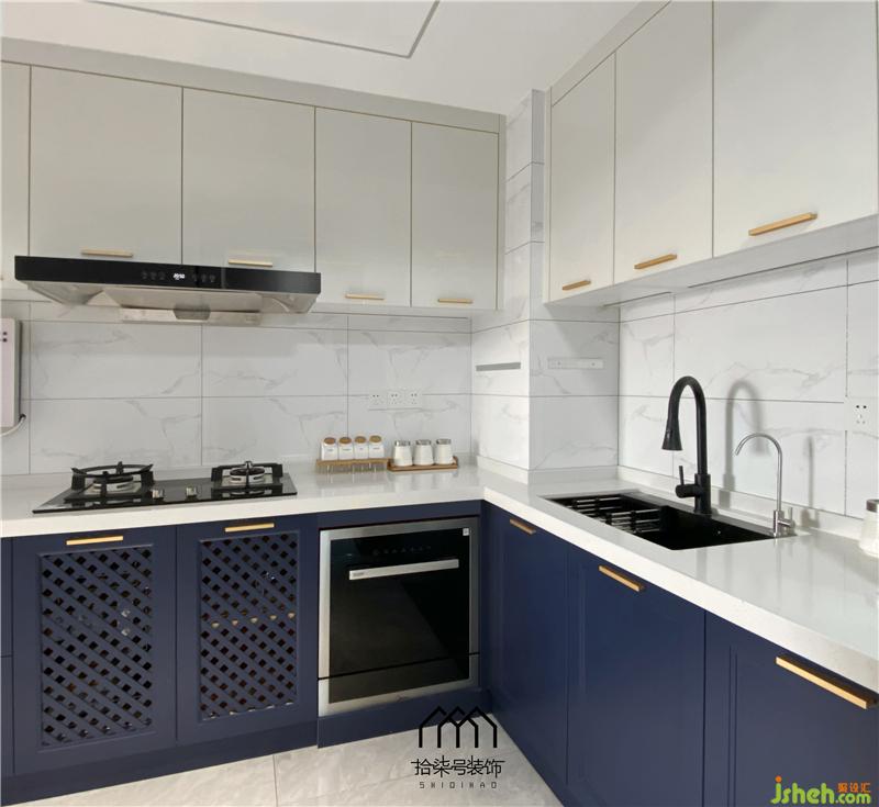 厨房与原有的小阳台打通增加使用空间,餐厅增加岛台使用起来更加合理便利。柳州家居装修半开放式厨房提高家人之间的互动,蓝白色调更突出浪漫气息。