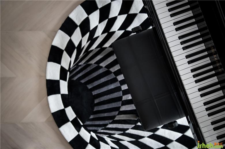 The geometric elements of carpet and the arrangement of black and white keys.The linear lights on the wall emit a soft light, and the air and the sound of the piano are integrated into one, accompanied by the starlight around the fingers, so that the baby practicing piano will be intoxicated by it.