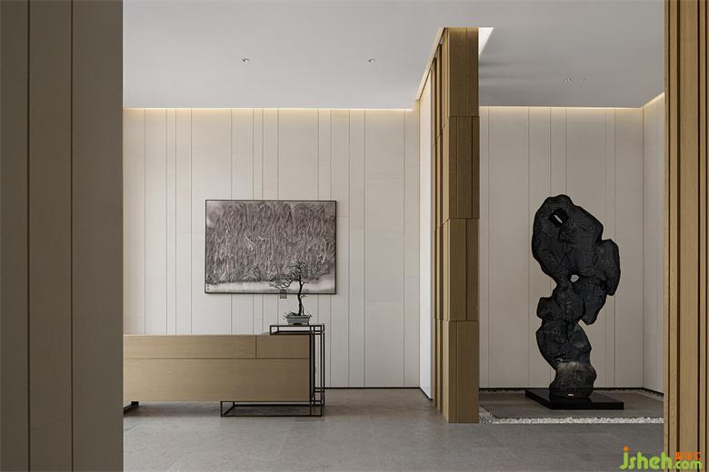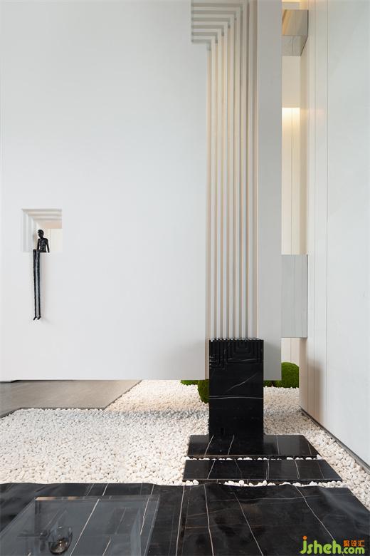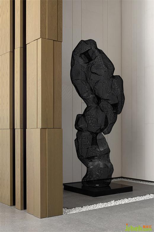 诗意空间设计立足中国传统,倡导「诗性东方」独特语境下的设计表达,淡雅的米黄石材与温润的木纹贯穿整个空间,开门见山,柏悦公馆会所设计黑色金属太湖石艺术装置隐在几何体块肌理错落的格栅之后,若隐若现,疏处不虚。