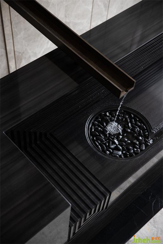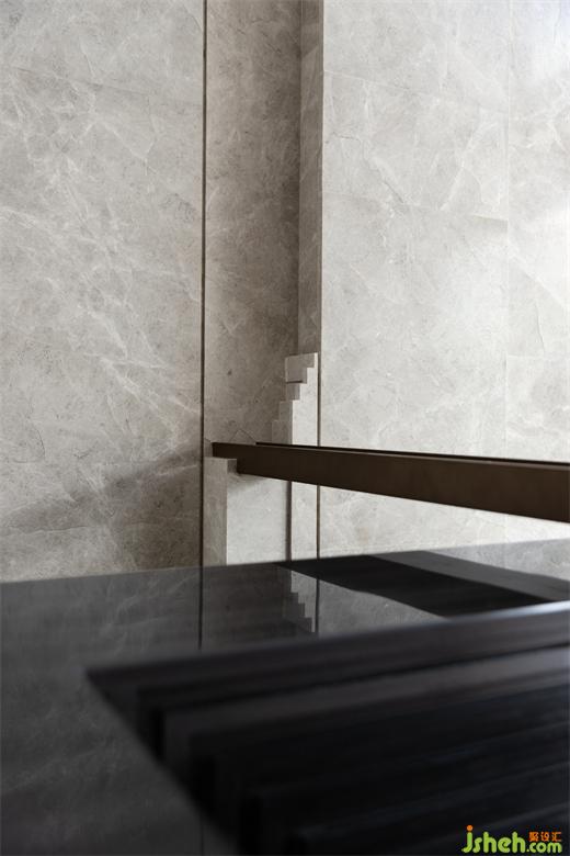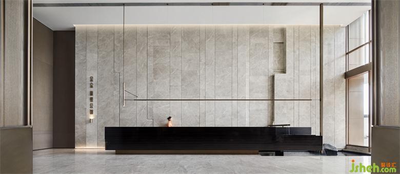 步行穿越室外岭南园林意境的山重水复,接待区笔直的几何线条与淡雅的灰色木纹石材交织出一派宁静深远。借助竖向且有韵律的线条将立面灰色木纹石材纵向铺排,包裹黑色木纹石材的长条接待台延伸着空间尺度。