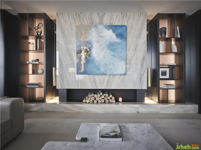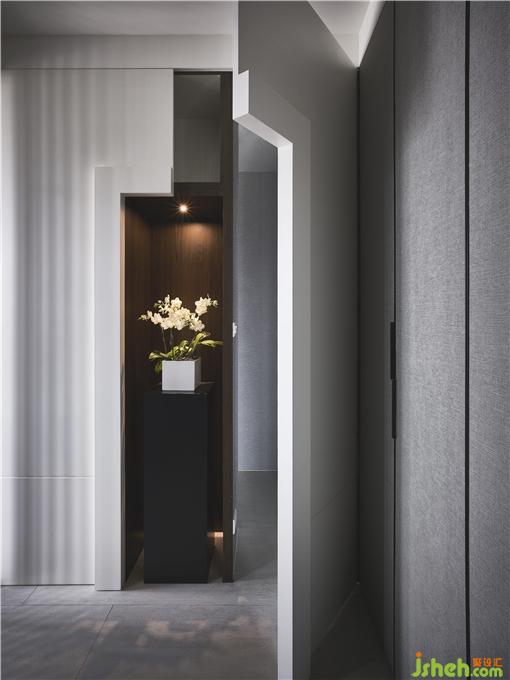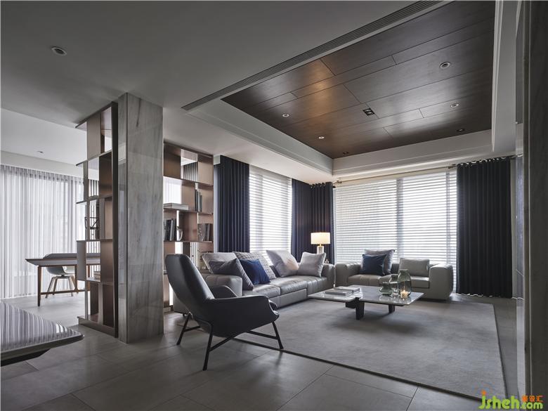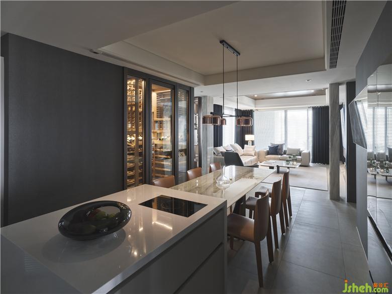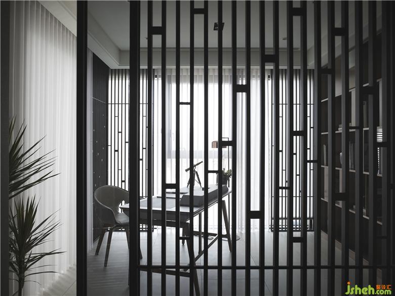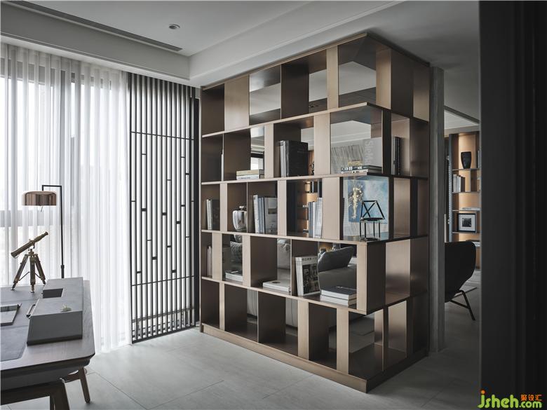 本案隱藏於玄關後方的隱藏衣帽間,利用衣帽櫃凹洞達到展示機能,成為入門端景。推開左側格柵門片,一處進門後可稍作沉澱的多功能書房,窗面兩端同樣以不規則寬窄線條交錯的格柵屏風營造寧靜感,當日光灑落即形成有趣的光影律動。具透視感的鍍鈦櫃體既是書櫃,也是界分區域的造型屏風,更拉伸了沙發背牆的尺度,成就完整大器的客廳。緊鄰客廳的開放式餐廚,運用結構柱的深度延伸出酒窖,餐敘場域在穿透開闊的空間,細細品味生活。装修公司