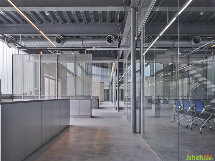 原为仓库空间的基地,保留旧建筑的结构与布局,在既有的围栏著上柠檬黄的轻盈色调,彷如新生品牌的革新企图。半透光的U型玻璃取代正立面铁皮及开窗,一解晦暗的厂房通病,随著流动的采光浸透于玻璃外墙,堆垛出各色的朦胧霓虹,与旁侧的浓彩厂办牆,建构一幅融合现代简约与色感美学的前卫立面。透明塑胶浪板搭建的回收所,藉由光线照射,成为一座发光装置量体,在前庭演绎回收再生的行为艺术。