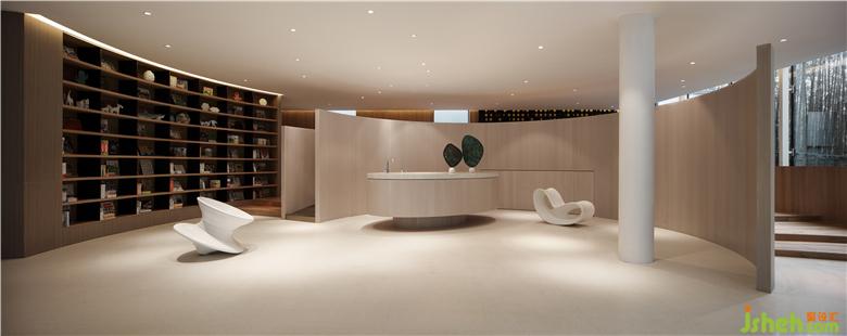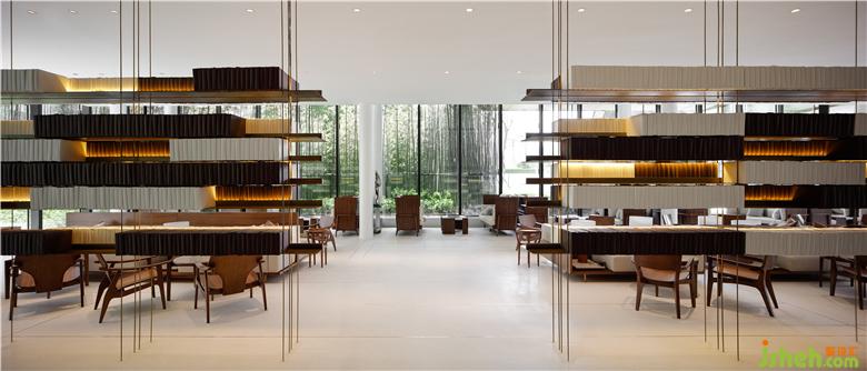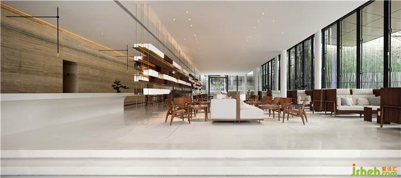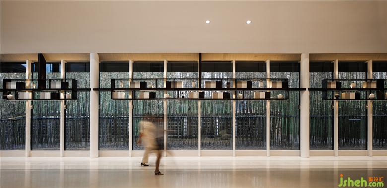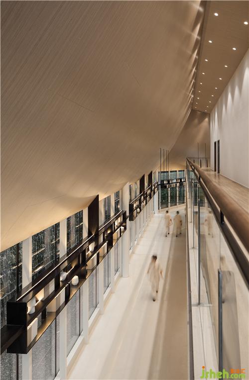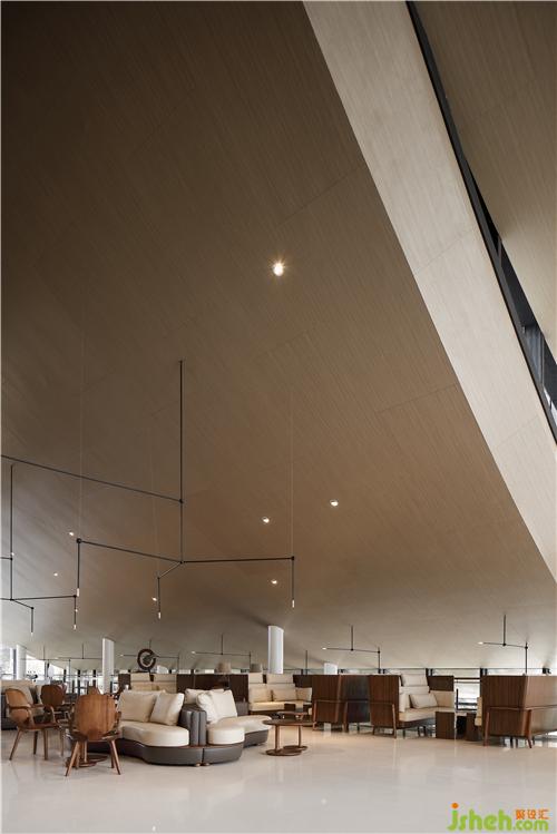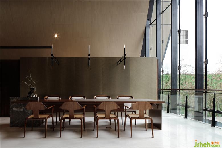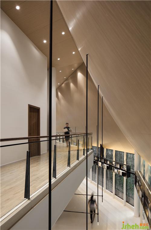 Black and gray steel bars form the spine of the rooftop, stretching and undulating like rolling mountains. Combined with the wide pool on the ground, a visual image of landscape painting is in sight. Transparent glass curtain wall interacts with reflections of clouds and lights in the water, creating a fascinating view and bringing spiritual peace of “A breeze produces no ripples”.售楼处设计