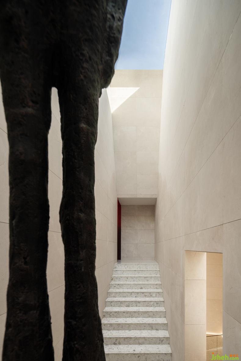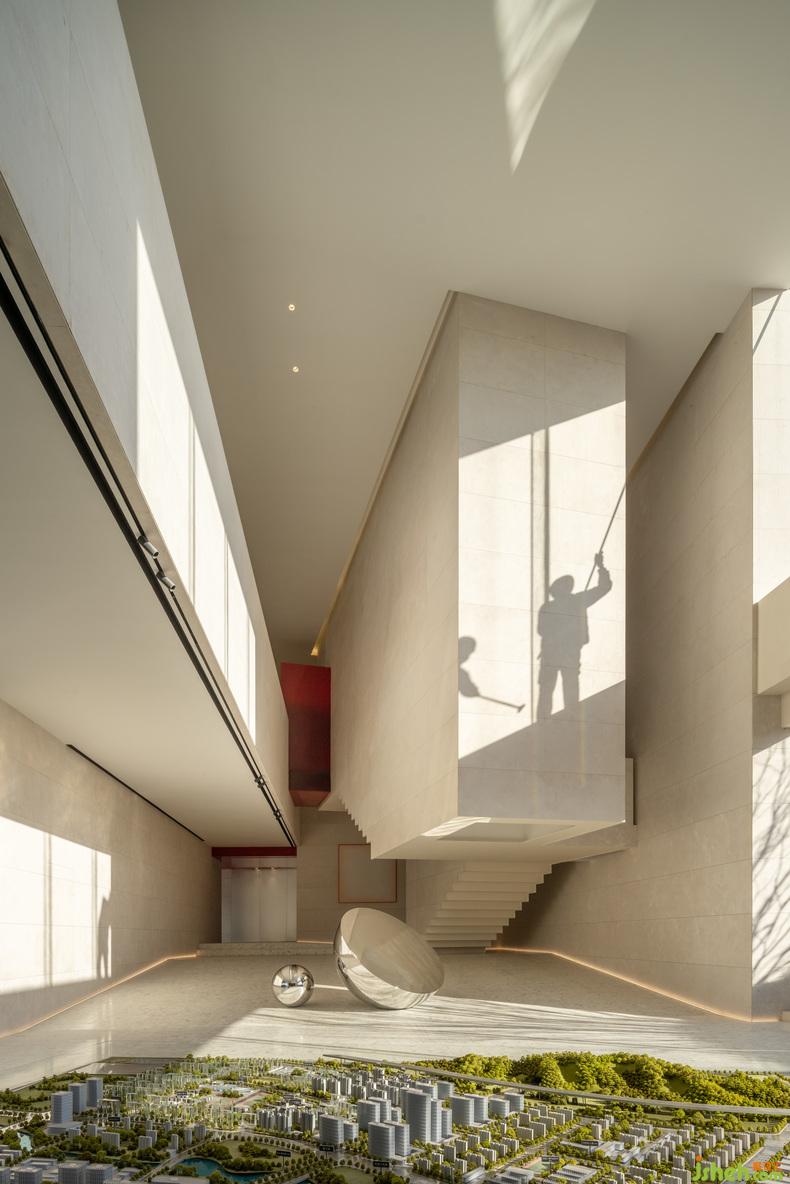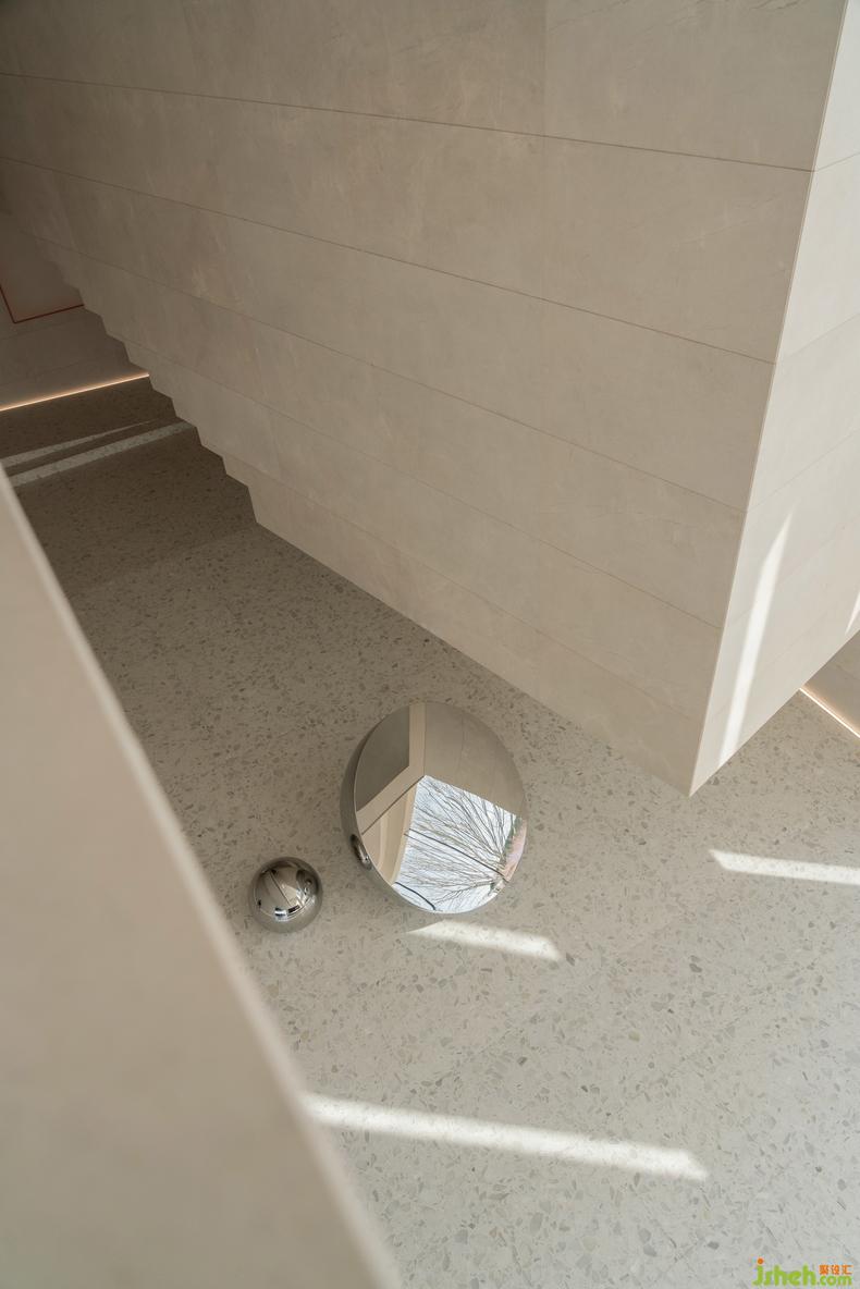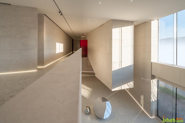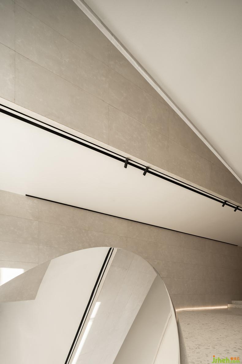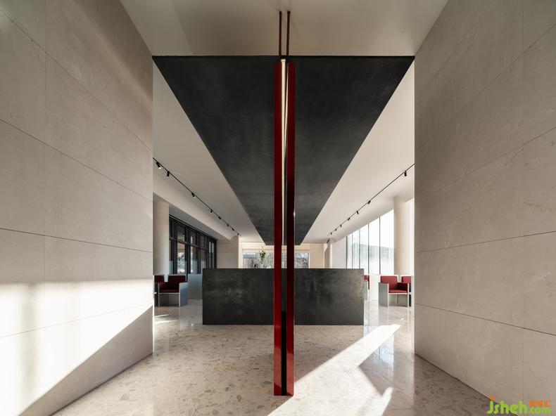 大幅蓝色安定了西侧咖啡厅,吧台或底墙,宁静如静夜海中黝暗的岛屿,安抚躁动,艺术中心设计使人放心将自己安置其中。饱满的红,乍然现身又爽脆地收边,例如中庭末端延伸向后的飞檐、色域之间的甬道,是路径上落下的面包屑、画中的楔子,毋需文字便能引导动线,使人顺应直觉探索未知,恰如创作者下笔时不假思索的意念。