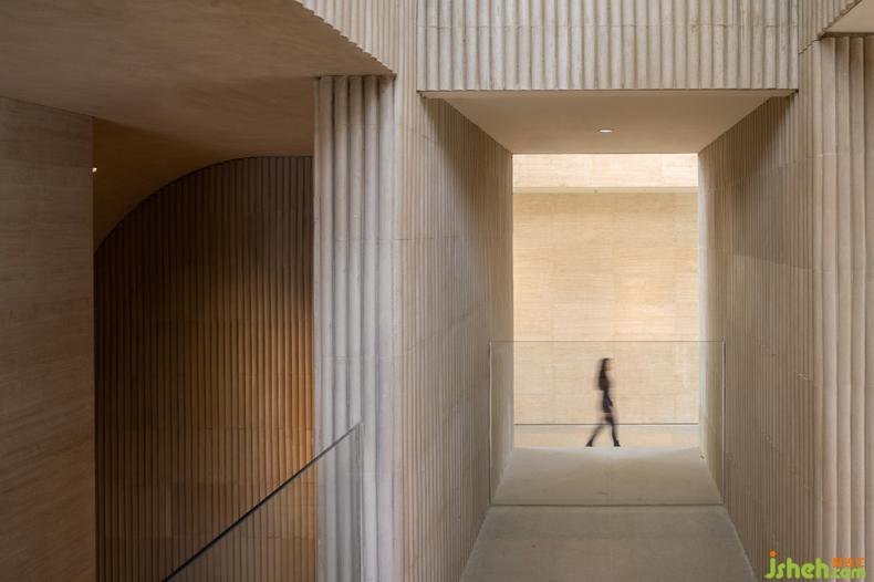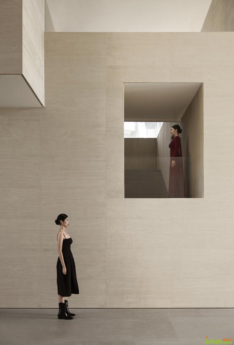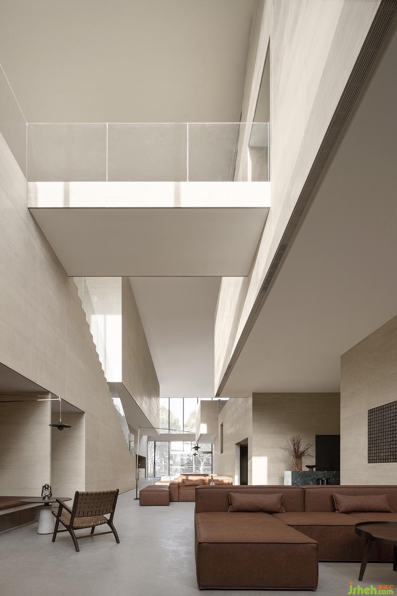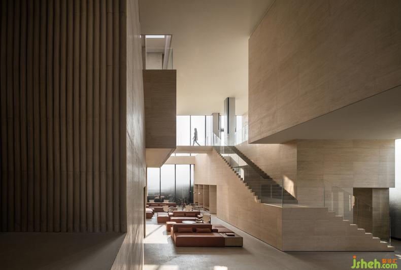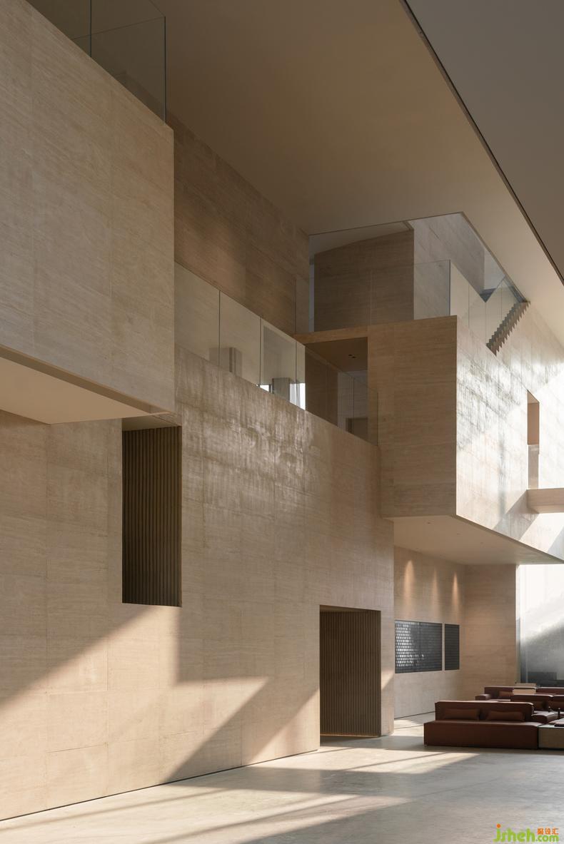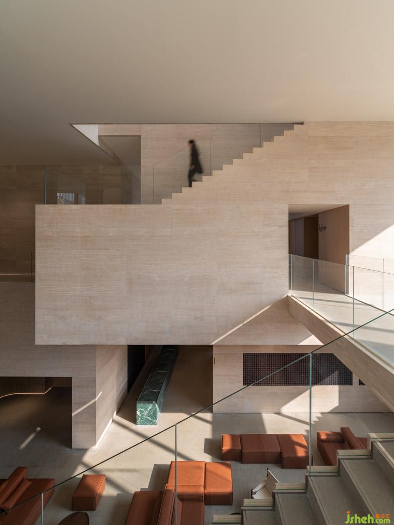 艺术馆设计的理念通过物与物之间的关系得以表现。二楼深度洽谈区的软装设计和一楼遥相呼应,互通有无。一样的以砖红辅以典雅的灰棕色调,极简地表述着相同的故事。精妙之处在于,设计者为了更能彰显建筑空间的气质,在沙发的选用上选择了更建筑材料一样的石材,再者,从细节处以金属和木饰面作为主要的材料,整个空间静谧且高贵。