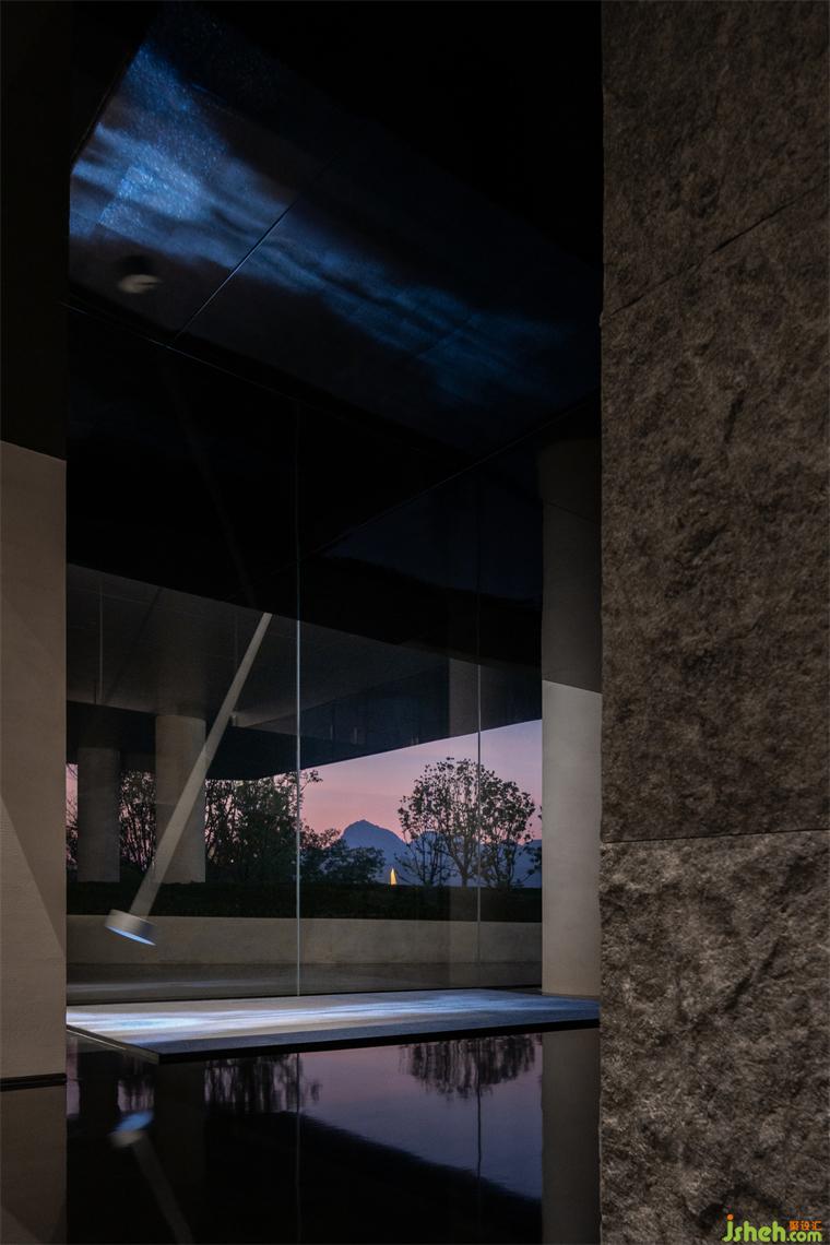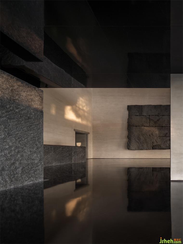 山前一泓深邃平静的氤氲江岸,装修设计映照峰林起伏与偶尔掠过鸟飞人影。设计师想像穿梭建筑内部如登山的修习,穿过枝叶相掩、巨石遮天的隧道或于崖下仰眺山峰高耸,感受个人心境转折及不执着物象的澹然。