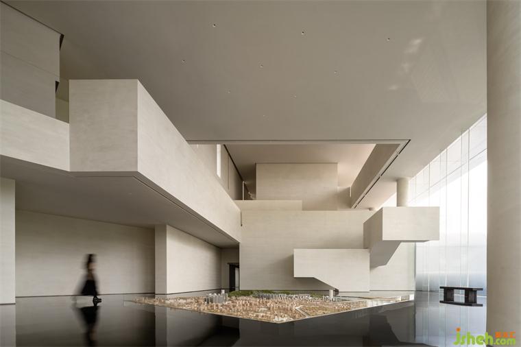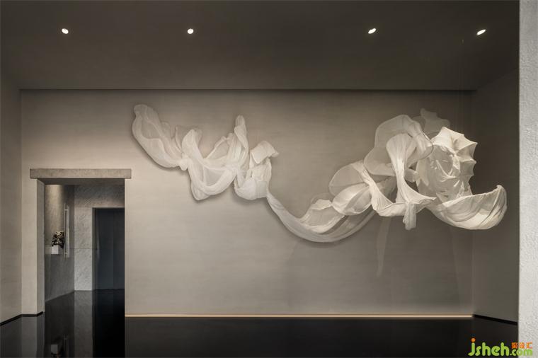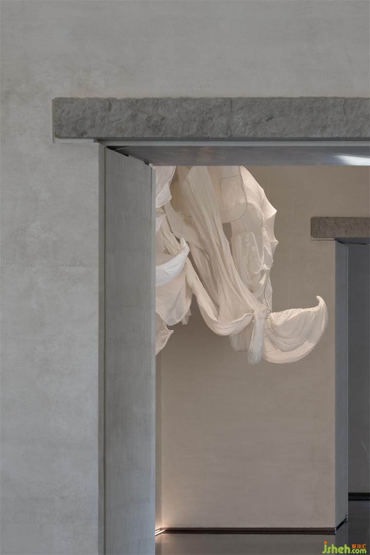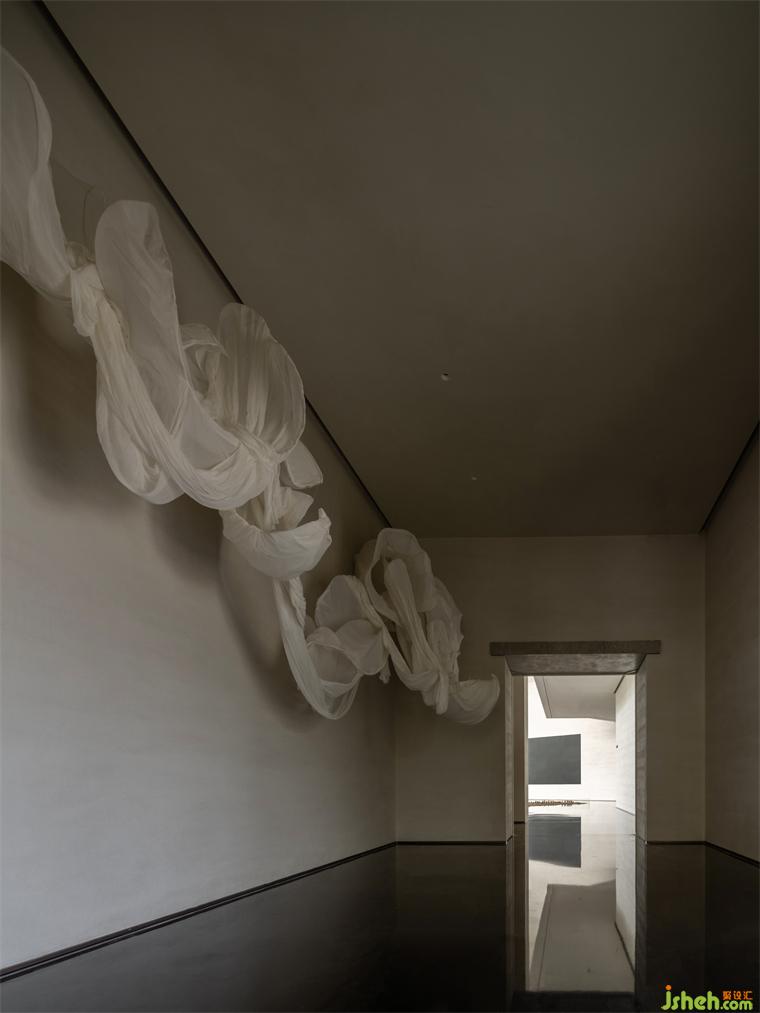 白色织品于壁面飞腾的凝结,装修设计像狂草连绵的放纵,亦如渔民在清晨江心抛洒渔网一瞬,人世间所有变动与灿烂,终将在山水间归于静定无波。用丝线悬垂勾勒出缥缈自然的纺织装置形态,彰显一种即兴的、无意识的表达状态,又恰似水墨入纸的一瞬间,空灵洒脱。