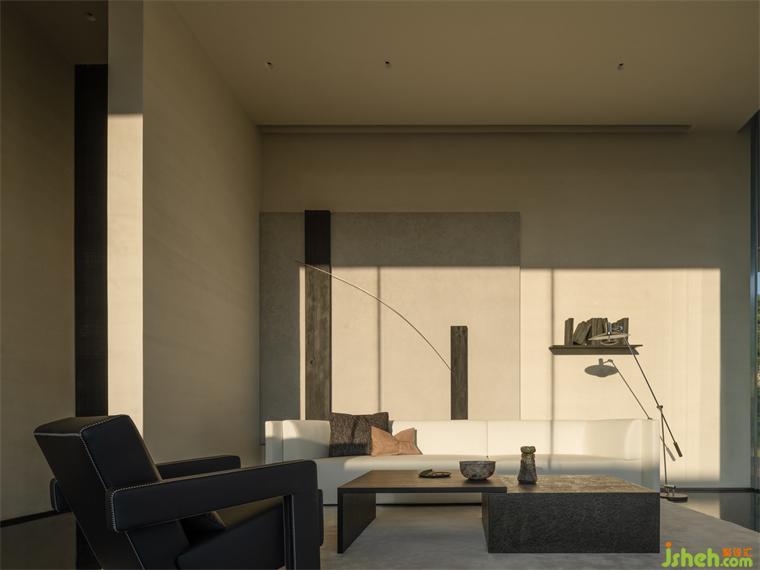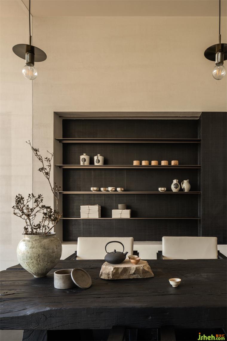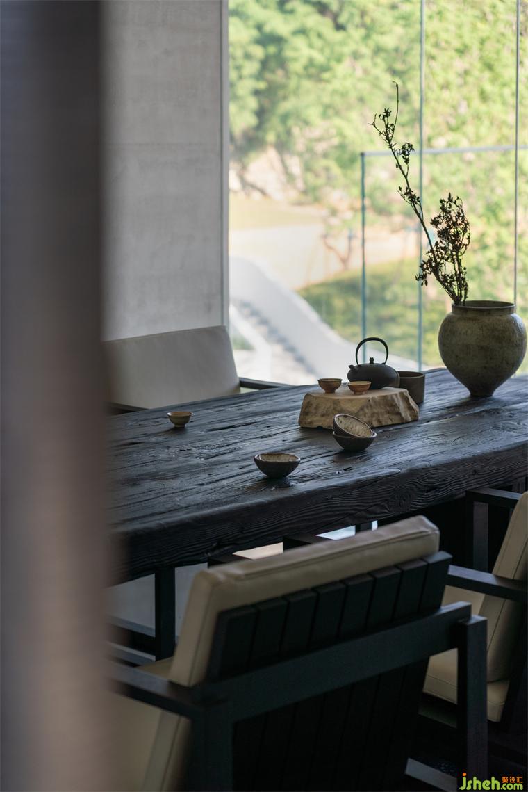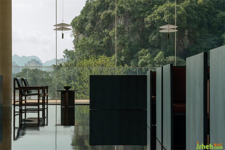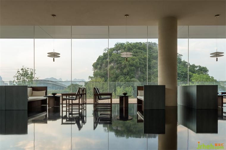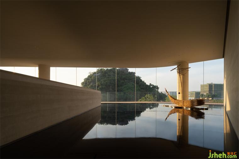 行至三层展示中心,装修设计艺术装置制作上采用天然的竹编材料,来自民间手工艺人手工数月精心编织,数万竹条都是手工一条条穿插制作完成。有意的保留竹条编织剩余须条,更贴近自然,烘托出手工时代感,整个装置处于顶层风景绝佳,渲染出柳宗元千古绝句“孤舟蓑笠翁,独钓寒江雪”的空灵意境。