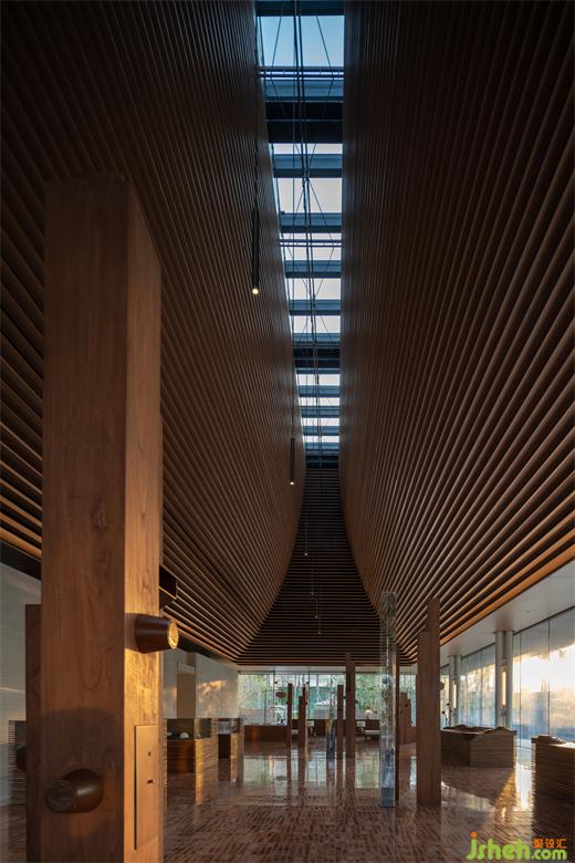 当业主方需三座馆舍架构起中心,南岛水岸特有的船屋画面激发灵感,与建筑单位共同讨论后舍弃冷硬框架,体验馆装修设计选择融合当地苗族「聚落式」建筑生态,包括内外界线模糊的皮层、坡屋顶轮廓,有助空气对流,也连结传统屋宇顺应环境的姿态。