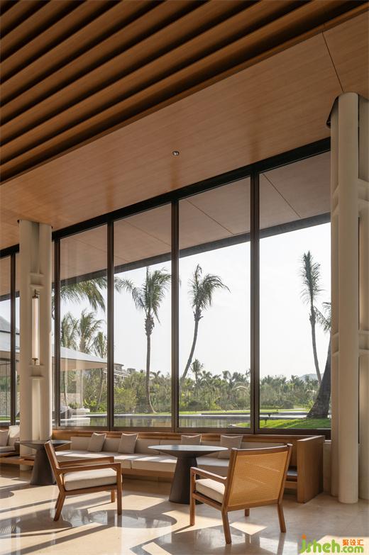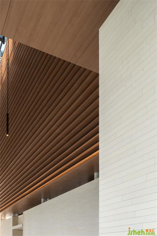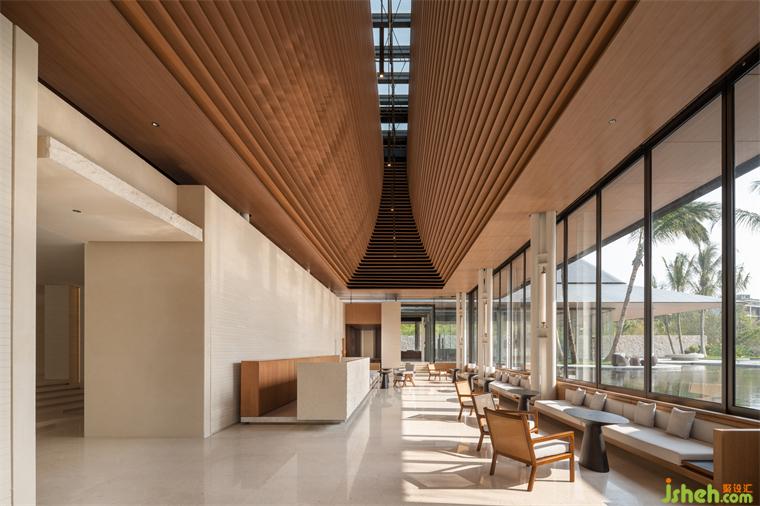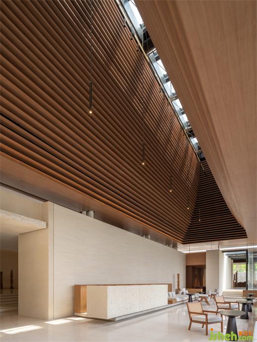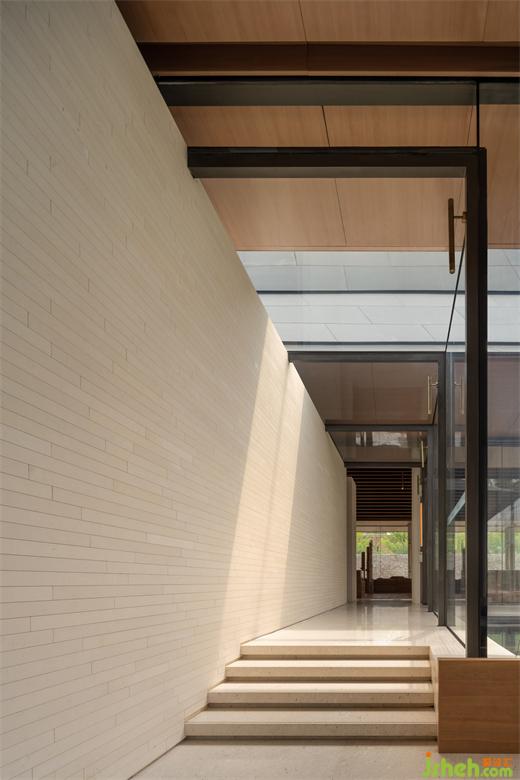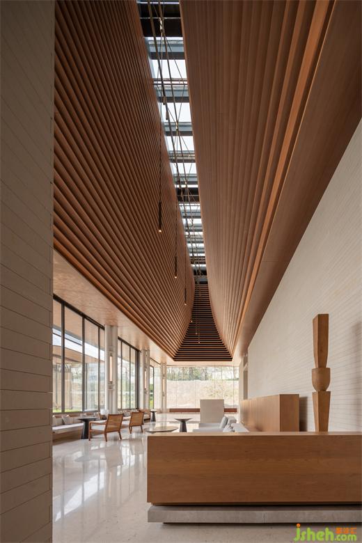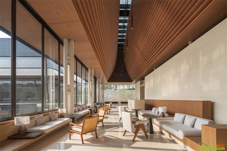 内部以木格栅、带状开窗控制日光,削弱柱框立面截断景色之感。道路旁、景观资源较弱位置,内退为服务核及后场空间。此外,为使设计所见即所用,也预想了未来应用面,体验馆装修设计设定陈列及洽谈空间的多元用途,以便适应、延伸利用。