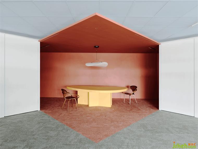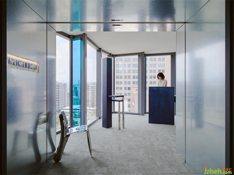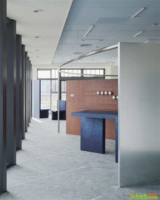 为此,设计师将入口临窗西晒侧设定为短暂停留的动线区,让工作位置脱开日晒范围,别于传统接待柜台及等候区模组,我们设计几座高背座椅建构这段过度空间,这些看似随机的块面如雕塑错落于窗边,办公室设计比固定隔间更具灵活性,其造型易于控制屏蔽比重又能遮阳,访客候位可于椅阴影乘凉,业主也能利用如墙形式配置品牌讯息。