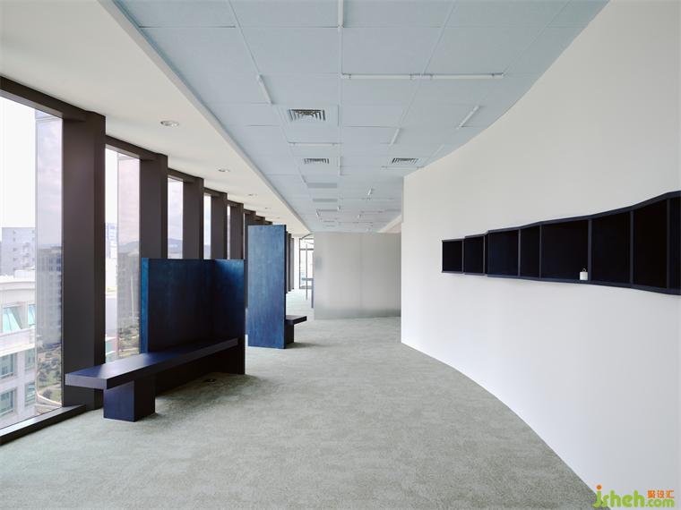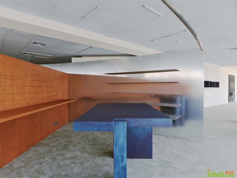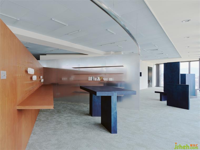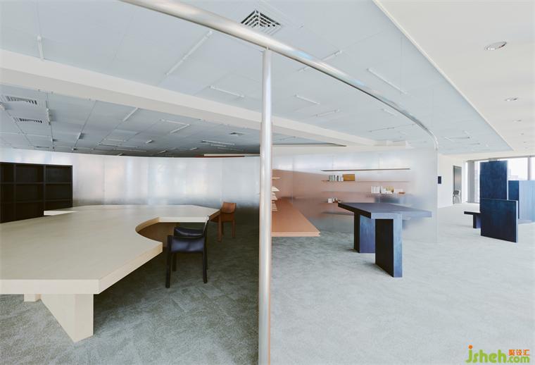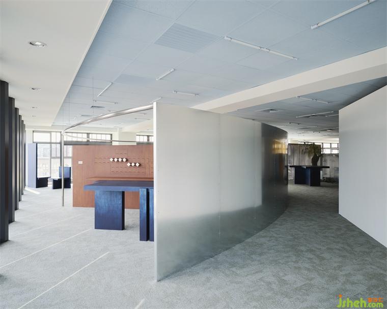 概分部门一段主要立面以不封闭动线的弧墙,渐次展开各区域工作动态。步入开放办公区,将先迎来商品展示区、商品开发部门及总监办公室。此区亦作为空间核心,水滴状曲面界定商开部座位与总监室的范围,却非完全截断动线、采光,由于商品开发部门是强调创意属性的空间,互动性跟关联性的需求强烈,也需比邻总监办公室,充分发挥讨论的即时性。