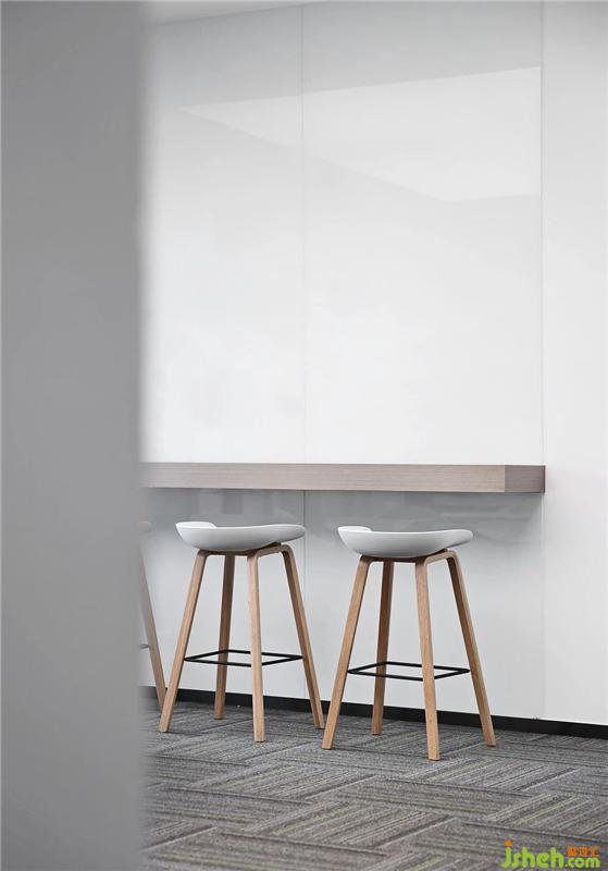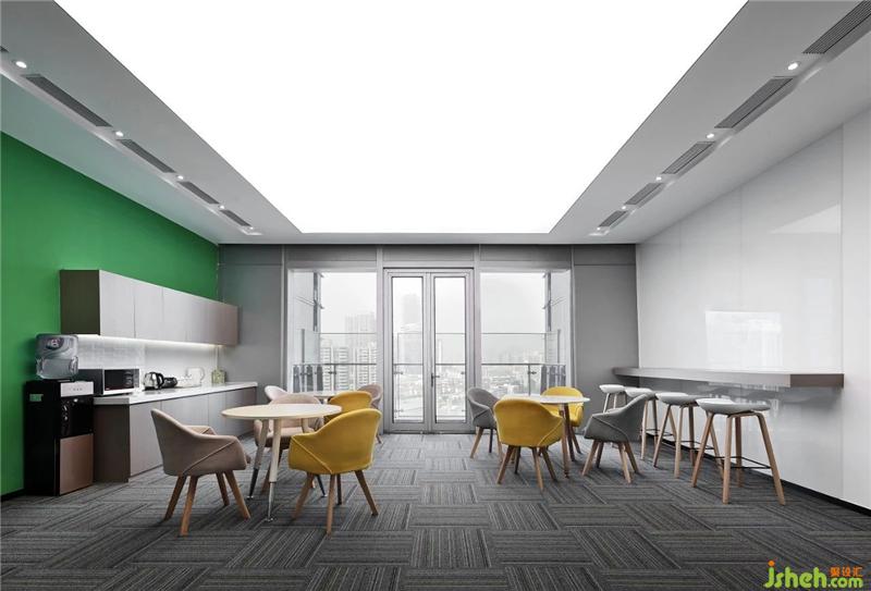 茶水间区别于公共区域的浅灰色调,企业主体色的点缀打破冷静的黑白灰,为办公场所注入更多活力和趣味,茶水间融入自然原木色,营造出细腻细微的的情绪氛围。