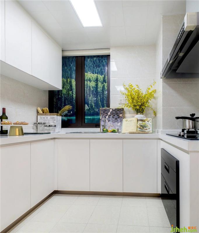 整体橱柜设计,瓷砖的色调及吊顶灯光,增加了空间的亮度。