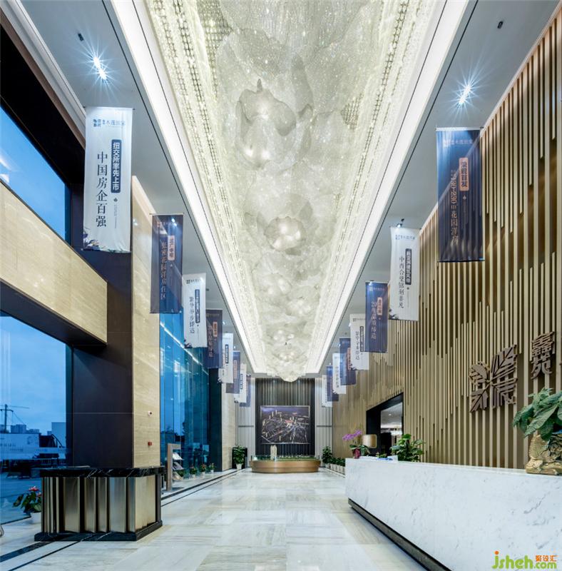 More than ten meters long chandeliers in the reception hall are superimposed in the form of pineapple beads, like petals and sky clouds. The space is more open, and the combination of color and material height explains the positioning of the spatial conception.