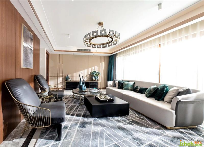 The open-plan living room is an environment-inspired embodiment of creative overflow. It is decorated with high-grade gray and classical green accents. It combines sleek and simple furniture styles to create a light and stylish visual effect.