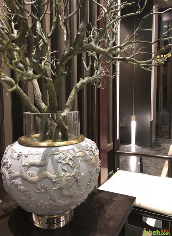 花器上,一条栩栩如生的飞龙跃入眼帘。龙,象征着权势、高贵、尊荣,亦是幸运和成功的标志。在主入口处摆放龙纹浮雕花器,局部描金,结合绿色干枝,以原始状态提升空间吉祥寓意。