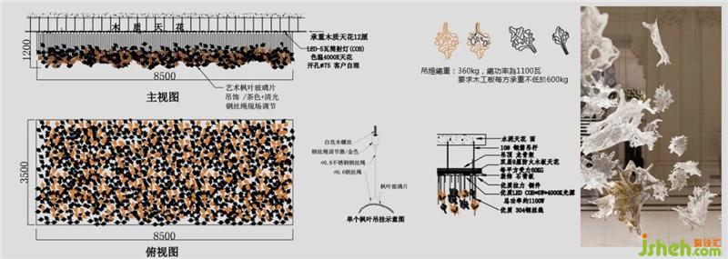 来到沙盘区域,售楼处的大吊灯是整个空间的亮点。从蜿蜒的江流轮廓中找到灵感,简化流水线条的变化,形成这样一种起起伏伏的大灯, 非常壮观大气,也非常具有体量感,体现整个空间的质感。艺术枫叶玻璃片吊饰中的黄色,则作为点缀色拉开空间的颜色层次。会所设计