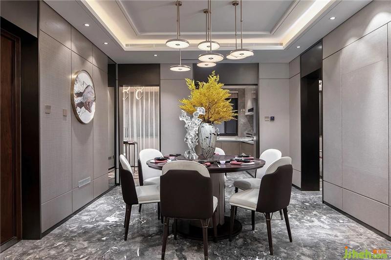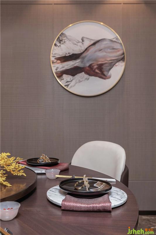 餐厅内的山水装饰与客厅相呼应,让膳饮变得生趣盎然:远处的山峦叠影,邈远宁静; 近处的水波流淌,仿若泛舟湖上。山水之间,生活的浮躁消失一空。The landscape decoration in the restaurant echoes the living room, making the dining drink interesting: the distant mountains and the shadows are far and quiet; the water waves in the vicinity are like a boating lake. Between the mountains and rivers, the impetuous life disappeared.