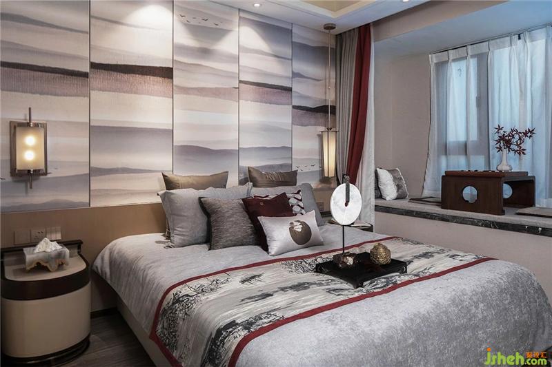 主卧背景墙水墨画意境清丽隽永,完美呈现静谧典雅的氛围。“静默中自有广阔天地,在有限中也能宁静致远”的力量感赫然呈现。古中国的风韵,经过了时间与空间的流转,在住客栖息之所落足。样板房设计
