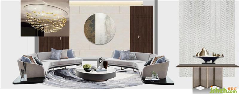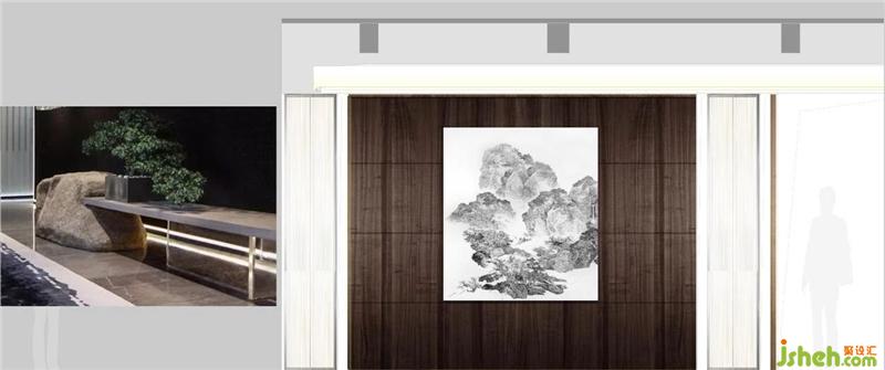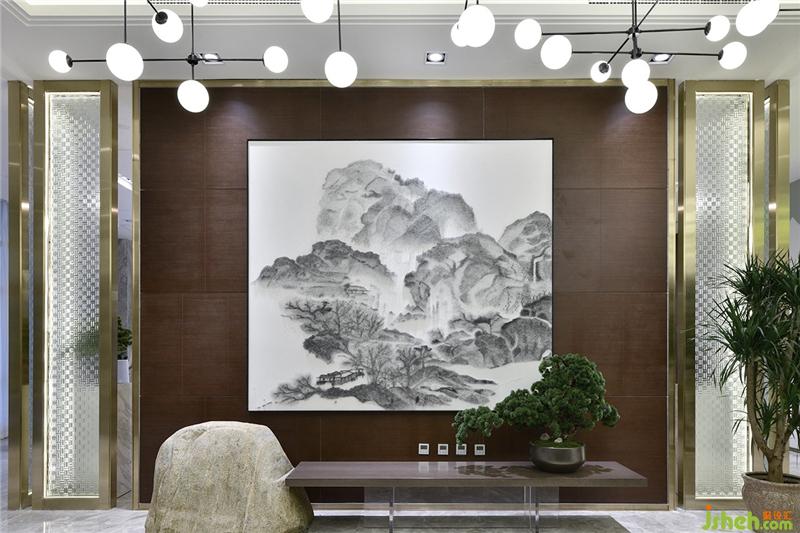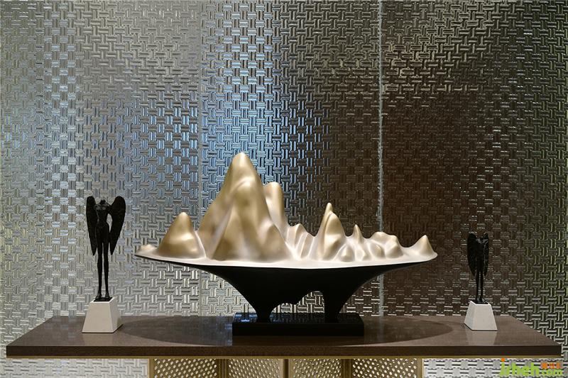 装饰画以“山”形贯穿于整个售楼处的各个空间,运用不同的装饰手法,着力打造把自然界的景致“山·水”概念以抽象的形式陈设其中。The decorative painting runs through the various spaces of the entire sales office in the form of “mountain”. With different decorative techniques, it focuses on creating the concept of “mountain and water” in the natural world in an abstract form.