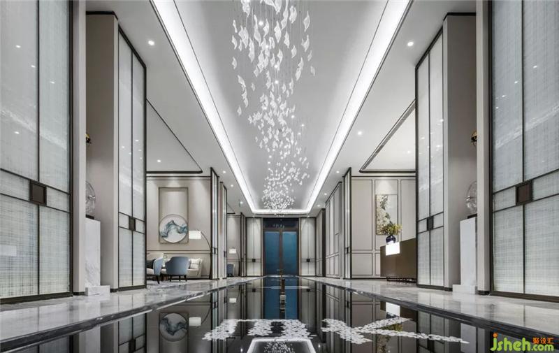 电梯厅雕塑结合自然元素的落叶和现代材质的铂晶,赋予空间更加形象生动的生机感和空灵意境,给整个空间带来一种和谐生态的审美体验。装修设计