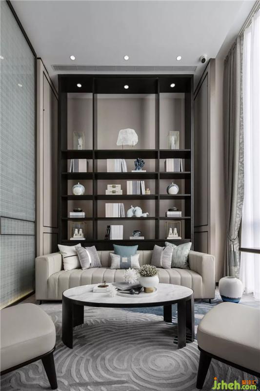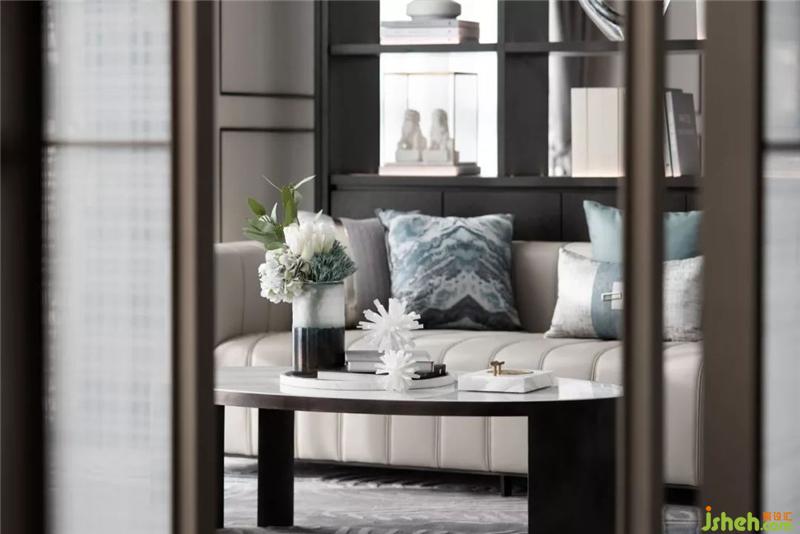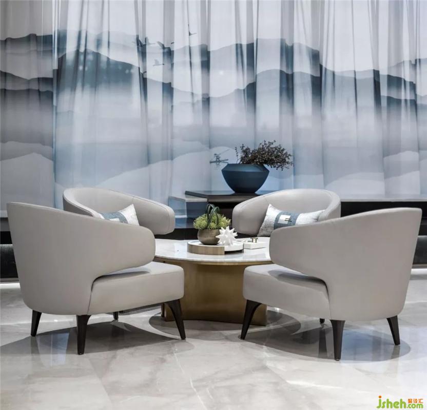 家具的设计与制造由传统和现代的材质相结合,低调的铜质金属在地毯水蓝色曲线的呼吸中唤醒了空间的精致感与层次感。装修设计