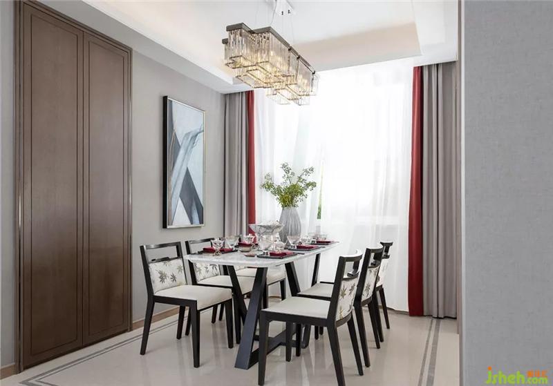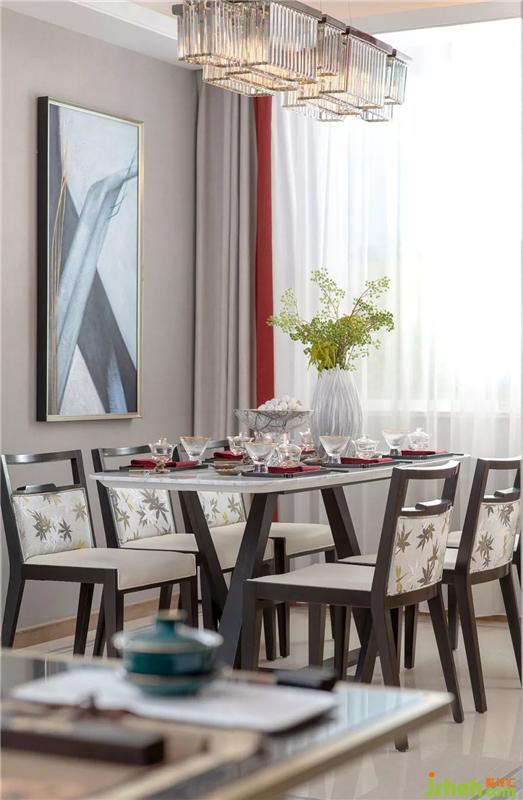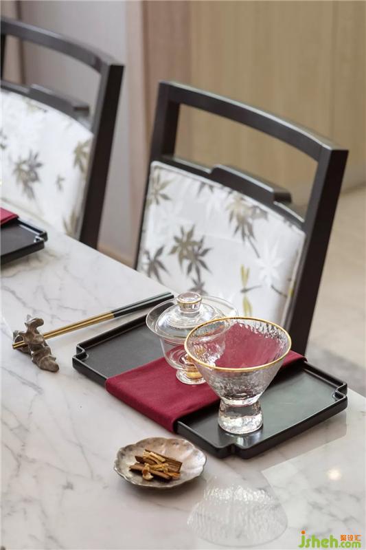 餐厅软饰延续了中式风格中端雅稳重的陈设意图,在中式摆件及艺术挂画格调烘托下,赋予空间内敛含蓄的艺术风韵。样板房设计