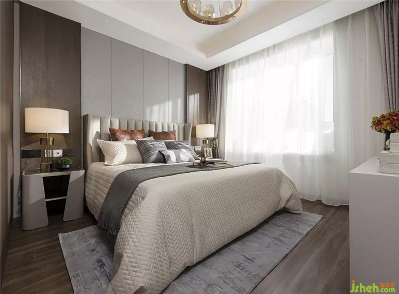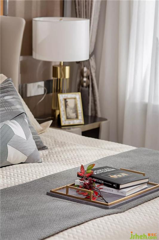 主卧选用浅灰色为背景主调,在木质、皮艺的拼接下,床头显得更加舒适。灯光色彩暖意安静,午后时光手持卷书,看见屋外偏偏落叶,九月静思良人。样板房设计