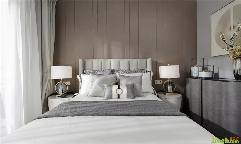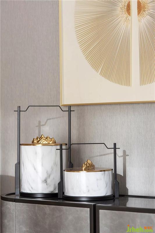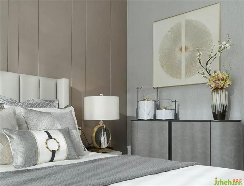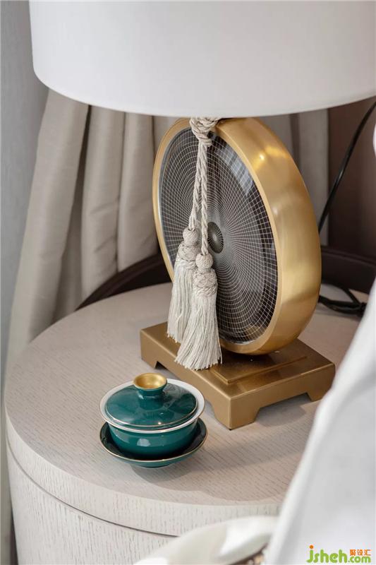 老人房的布设延续了素净的色调,东方的韵味是深厚浓郁的。几何艺术的变奏,在方圆分寸之间,与干枝花艺对比鲜明,素雅间亦有和润质感。样板房设计