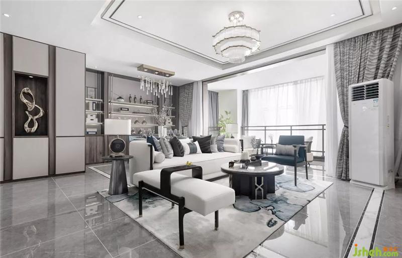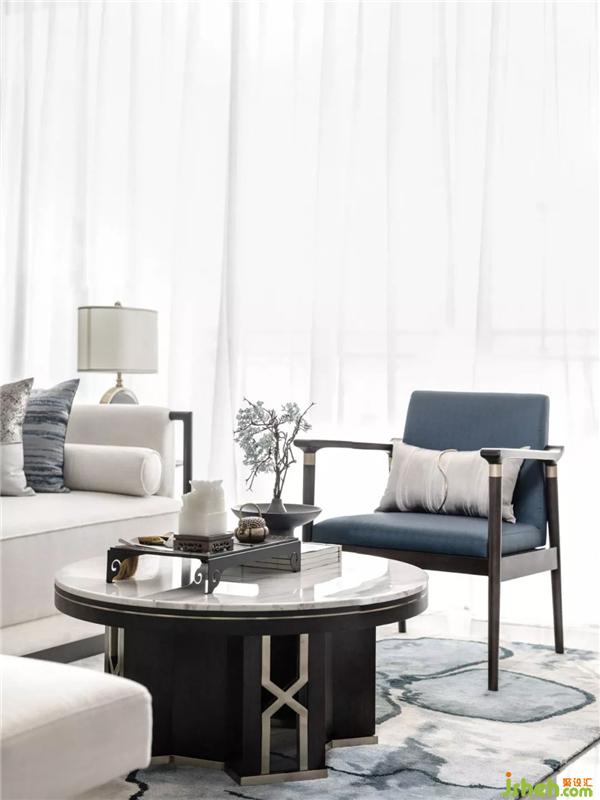 项目材质上选用温润的石材、精致的布艺、金属、水晶等;色彩上则运用清幽淡雅的基调,点缀沉静的灰蓝调,搭配大地色让整个空间干净简单却不平淡。样板房设计
