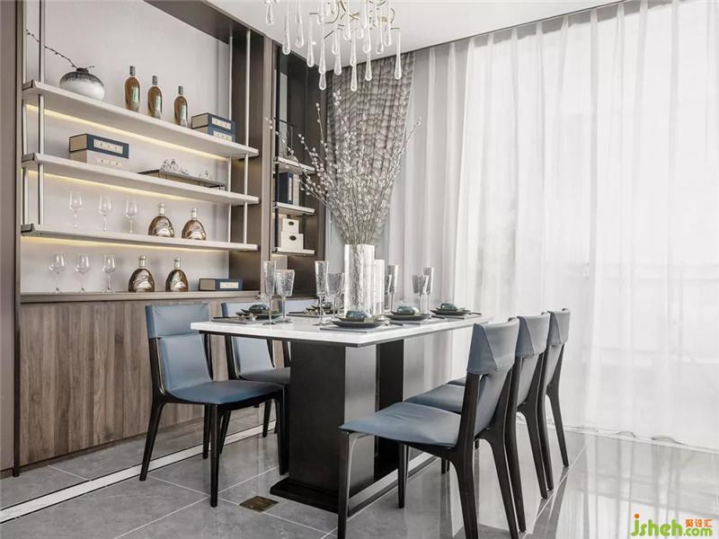 The material used in the project is warm stone, delicate fabrics, metal, crystal, etc; the color uses a quiet and elegant tone, embellished with quiet gray and blue tones, and the earth color makes the entire space clean and simple but not dull.