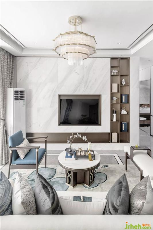 The living room space is dominated by elegant gray-blue tones, and the natural pattern of the coffee table marble interprets a landscape painting, which gives the space endless poetic imagination, giving people a solemn, noble and mysterious feeling.