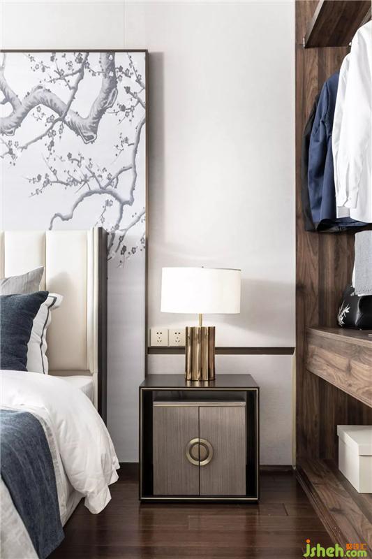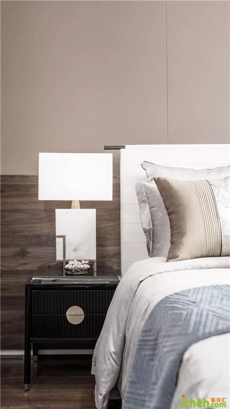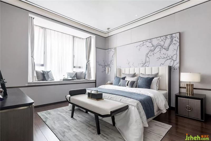 瓦灰色与湖蓝的床品搭配,编织着犹如湖边小屋静谧的画面感。那些精选的布料材质、细琢的小品摆件,更是点缀了空间独特的东方气质。样板房设计