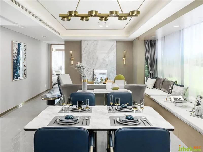 该户型在色彩上以金属的黄色系和浅灰色系为基调,加入灰但不失亮的蓝色系,丝丝涟漪又不失家的温暖,同时契合杭州湖水的蓝和夕阳的黄。样板房设计