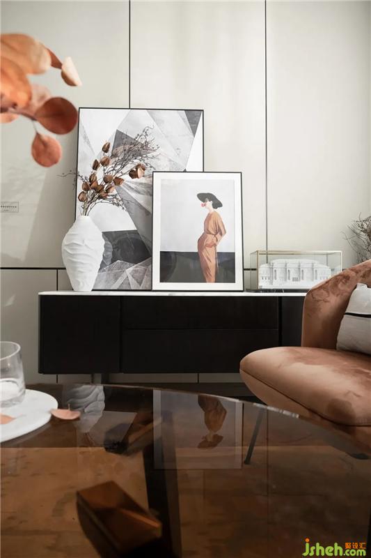年轻化的空间设计象征着活力,客厅装饰画运用法国独立设计师的艺术代表作,空间融入建筑主题的摆件,透露着简约而不凡的艺术气息。餐厅的家具同样选用意大利顶级品牌定制款,造型简约,色调深浅冷暖对比,精致的细节处理和流畅的线条,处处体现着年轻人的个性化品味生活。样板房设计