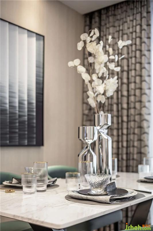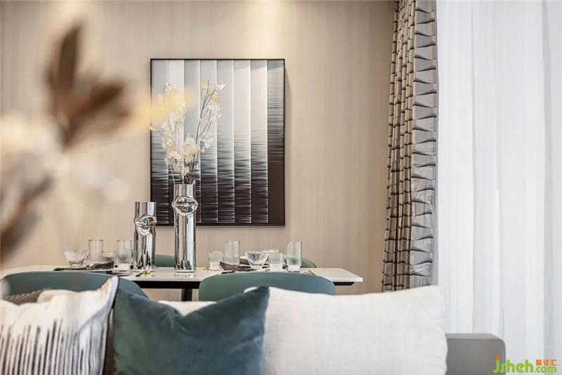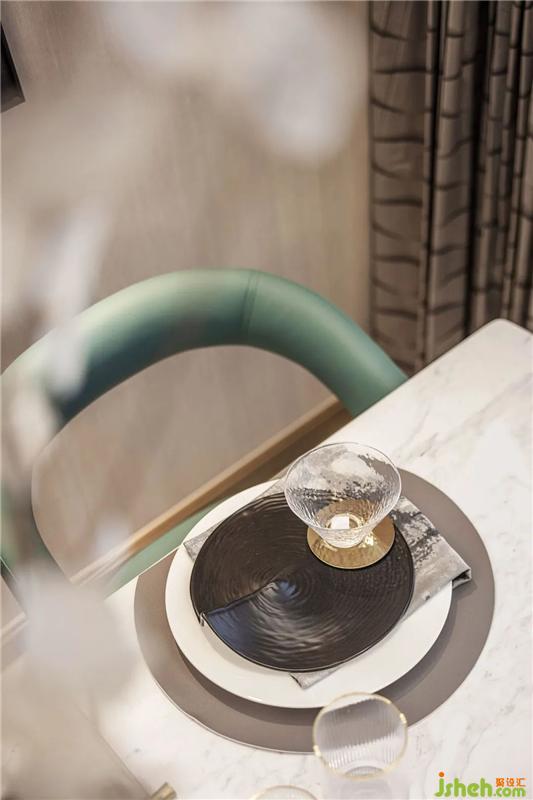 客厅作为空间交互的中心,大片落地窗与开阔的阳台,让光线被最大化地保留。扑面而来的绿奠定了空间的清凉感,金属元素以不同形态点缀在家具、灯饰的细节上,空间显得更加清透、明澈。当代都市人追求的绿洲情调随着颜色和材质的晕染,意境全开。