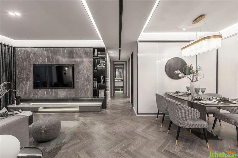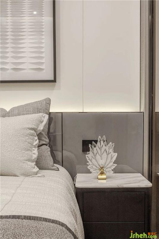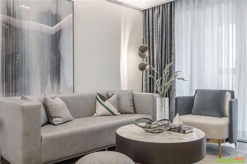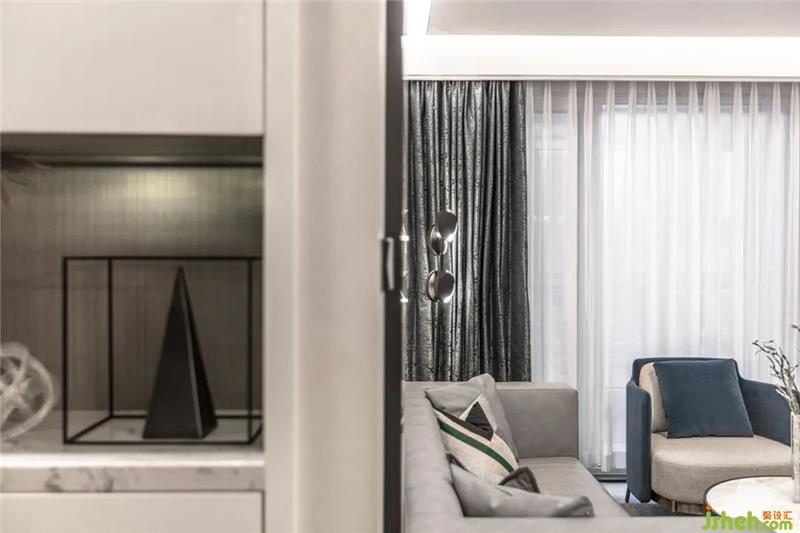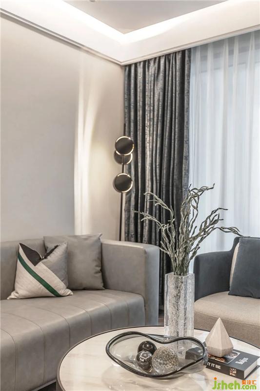 The overall space is almost entirely composed of low-saturation colors, with gray as the bottom of the muscles, giving a comfortable and quiet visual experience. The use of emeralds and exquisite decorative paintings have become the artistic power that runs through the space and stands behind the sofa. It is like being in the golden sycamore in the city of Nanjing, lighting up the space vision.